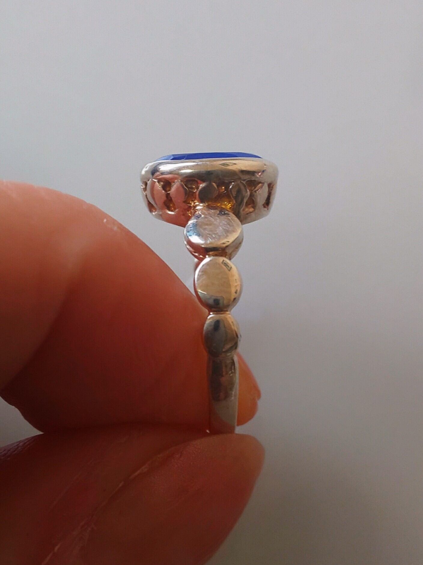 シルバー925にカルセドニーの綺麗なブルーの石が入ってます。両サイドには丸を潰したようなデザインが入っており厚みもしっかりあります。