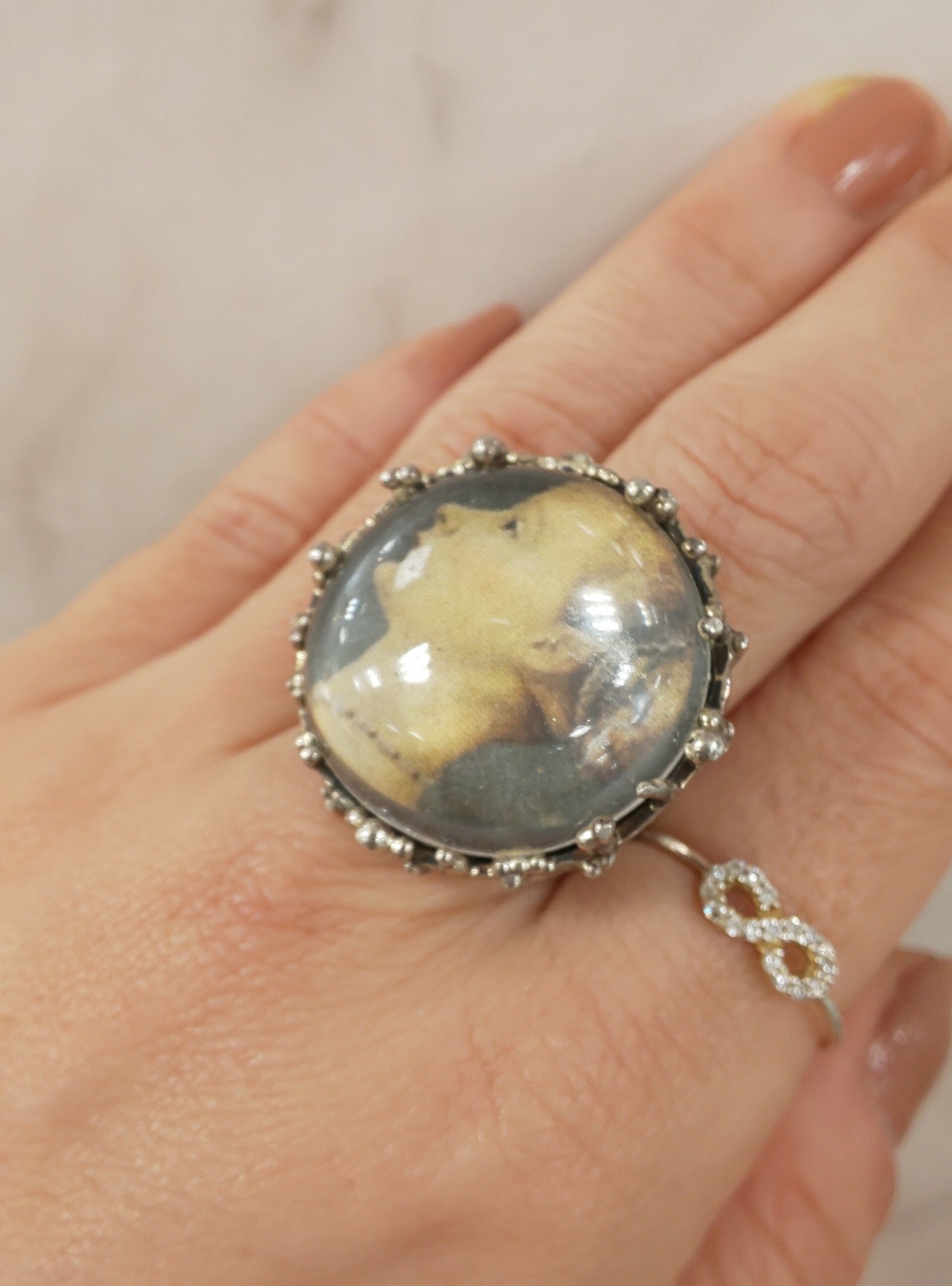 絵はミラノの美術館ポルディペッツイオーニの代表作。その上にクリスタルをのせて丸く仕上げました。周りもアンティークスタイルの枠を付けました。