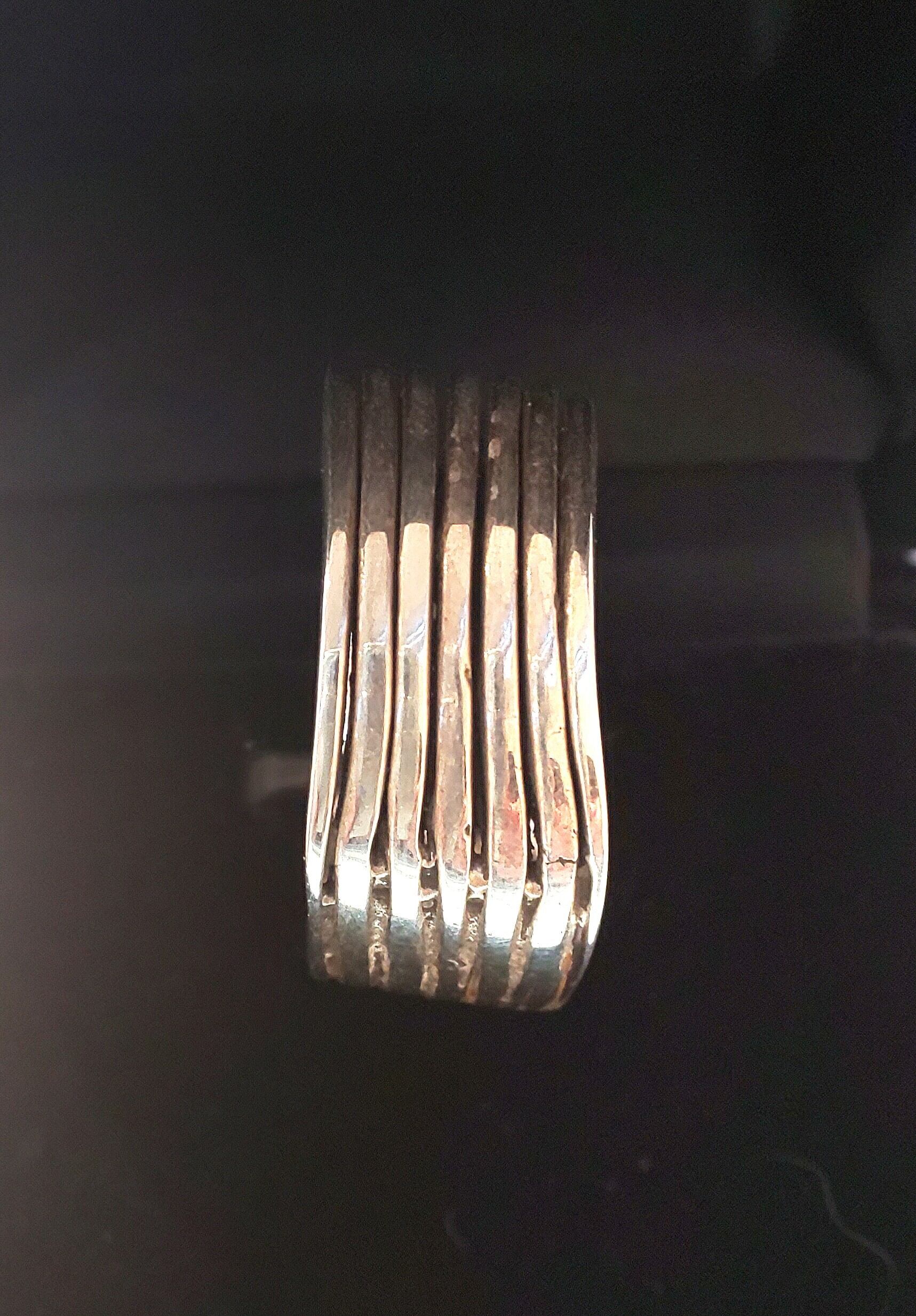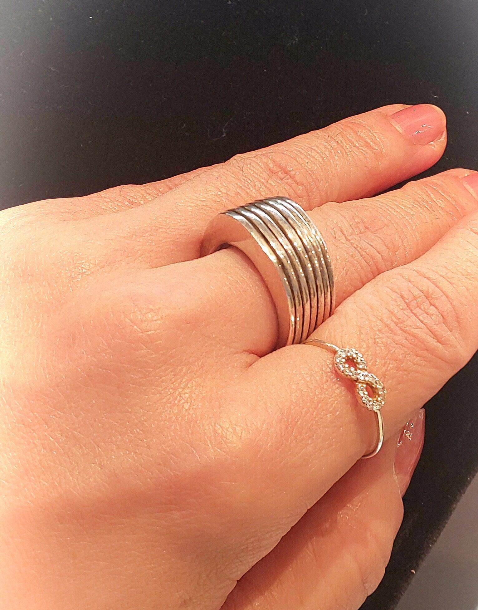 7連が後のみ繋がっていて1本1本の間は微妙な隙間があります。重みもあり個性的な指輪好きな方向きです。