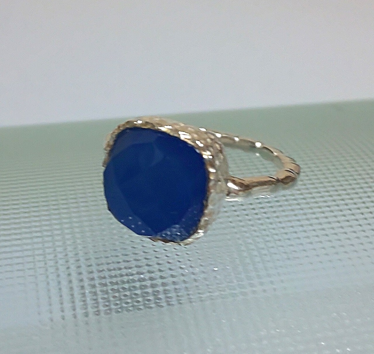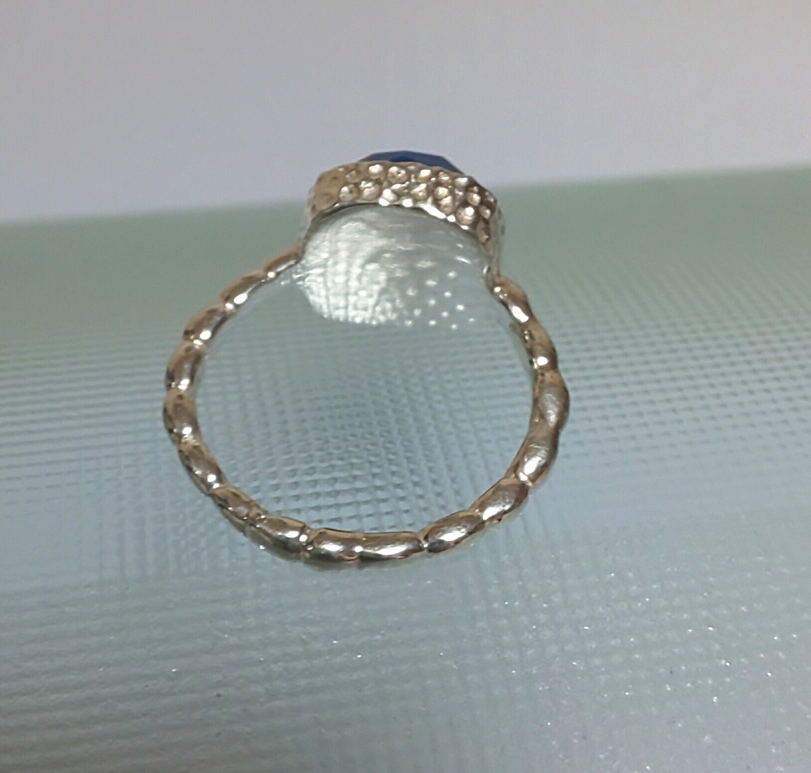 ブルーカルセドニーの色が濃くてカッティングの綺麗。リングも小粒が繋がった様になっており、石の台も厚めでボコボコした細工が入ってます(^^)