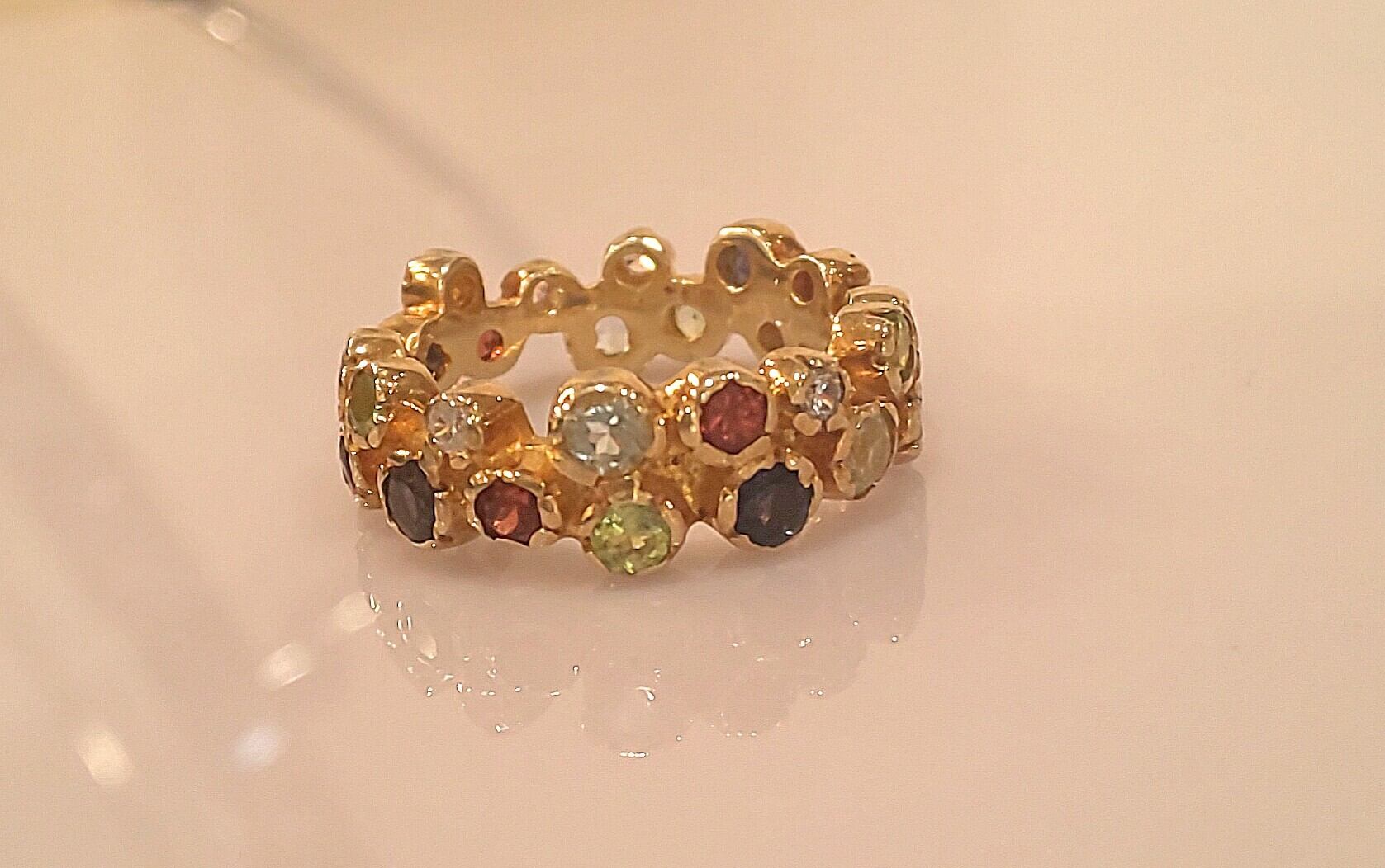 いつもシルバーですが、金メッキかけたものもあります。多色の天然石がたくさん入って楽しいリングです。