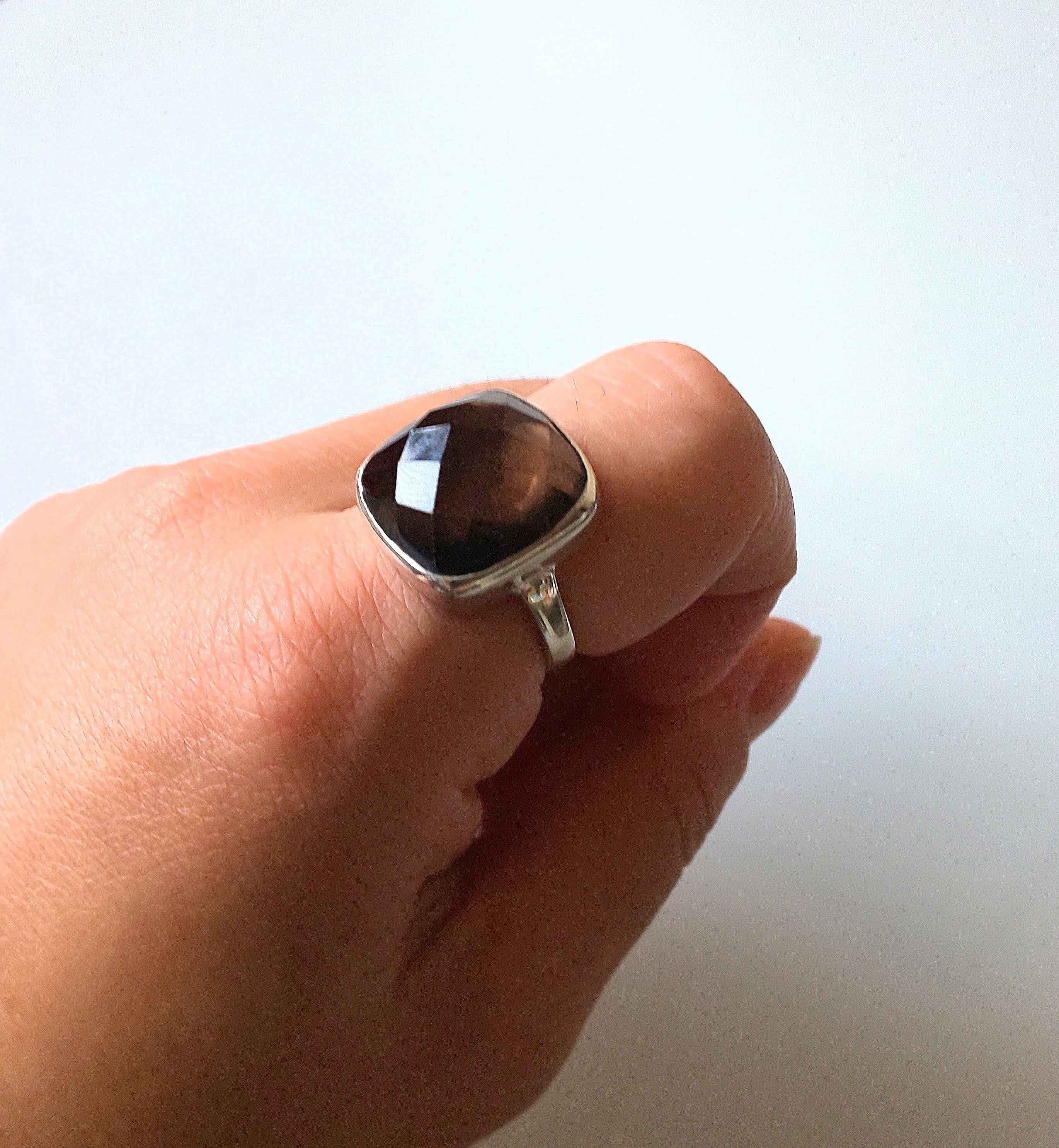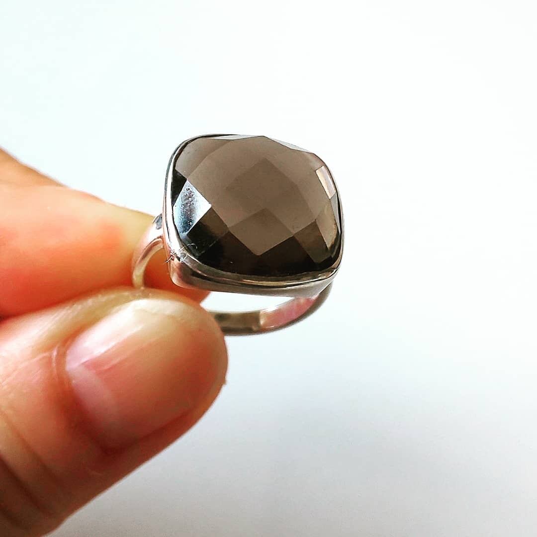 フィレンツェの工房より直輸入。1.6cm四角のスモーキークオーツにカッティングが施されています。大きいのに上品で日本人の肌色には誰にでも似合う石。