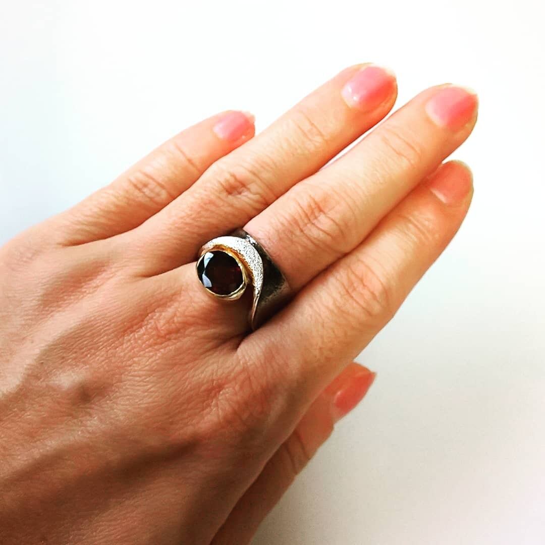 幅広いリングでクロームメッキ加工、18金メッキをふちに、シルバーの艶消しまで入れています。ガーネットも幅1㎝でテーブルカットされた綺麗なものを使ってます。