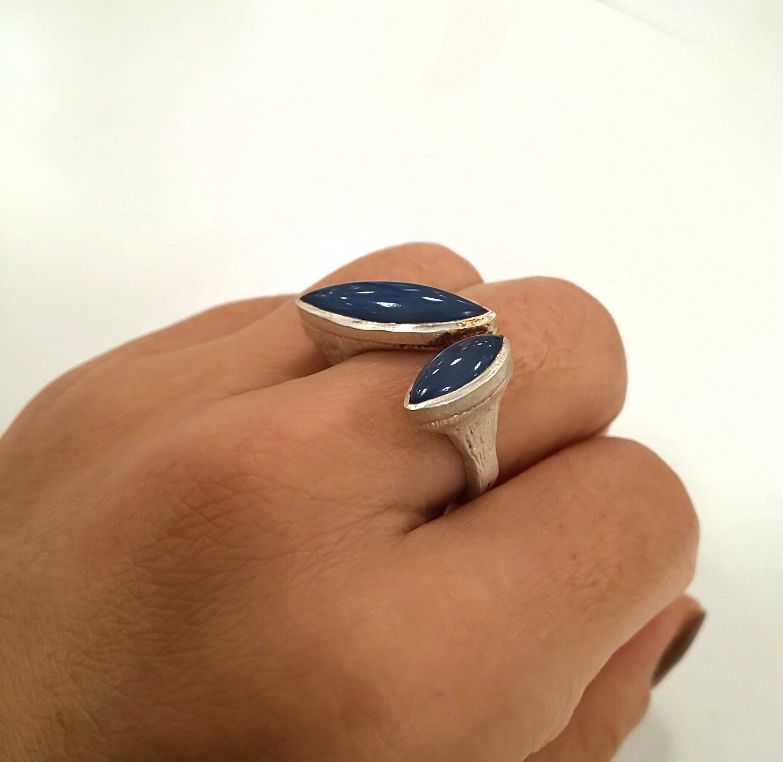 艶消しに枝のようなカッティングが入ったリング。カルセドニーのブルーも薄めで綺麗です。