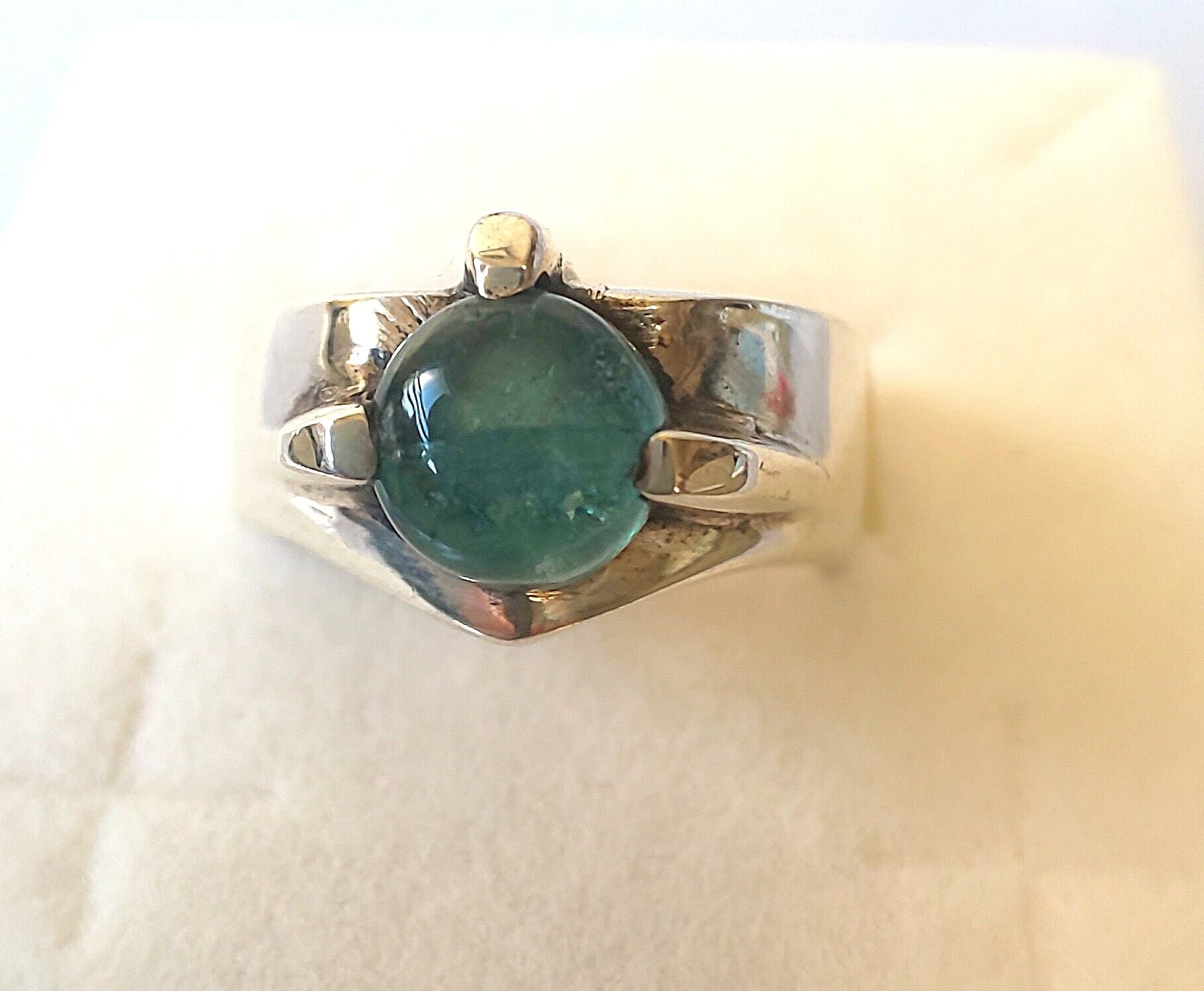 ブルーグリーンの色が魅惑的なアパタイトです。リングも太くて安定感があり、石の付け方が3点留めで下が少しV字になっているのも面白い!