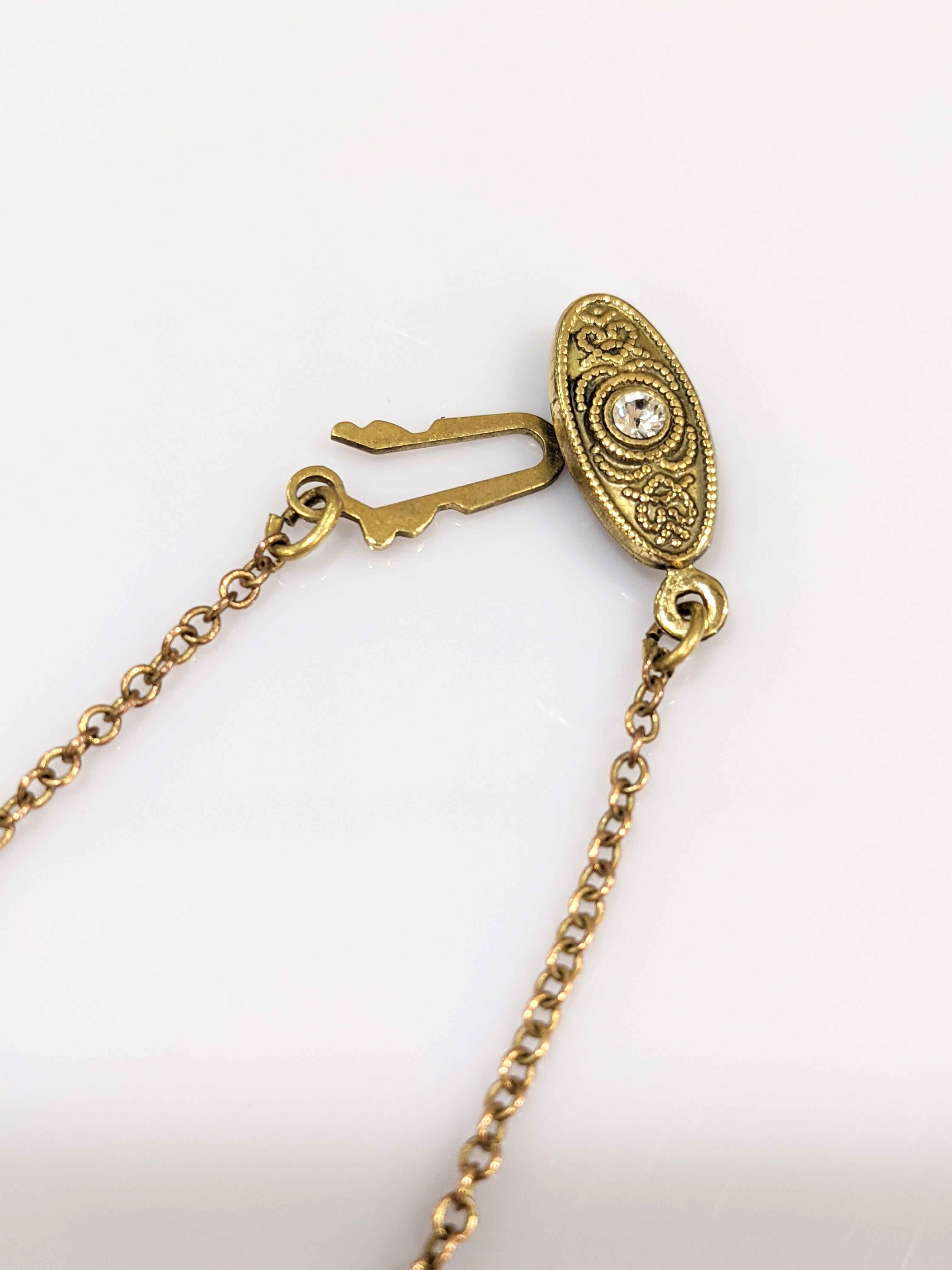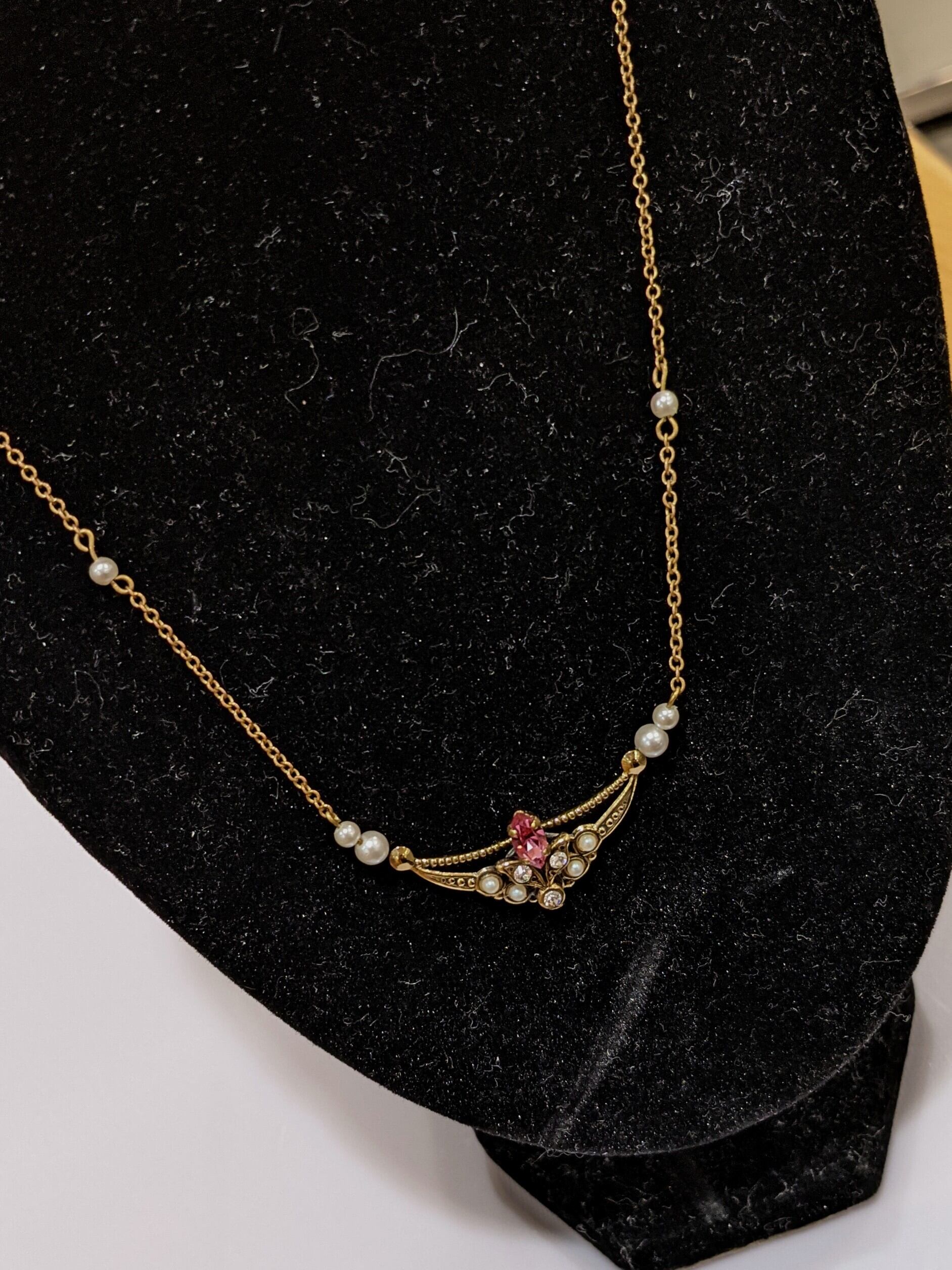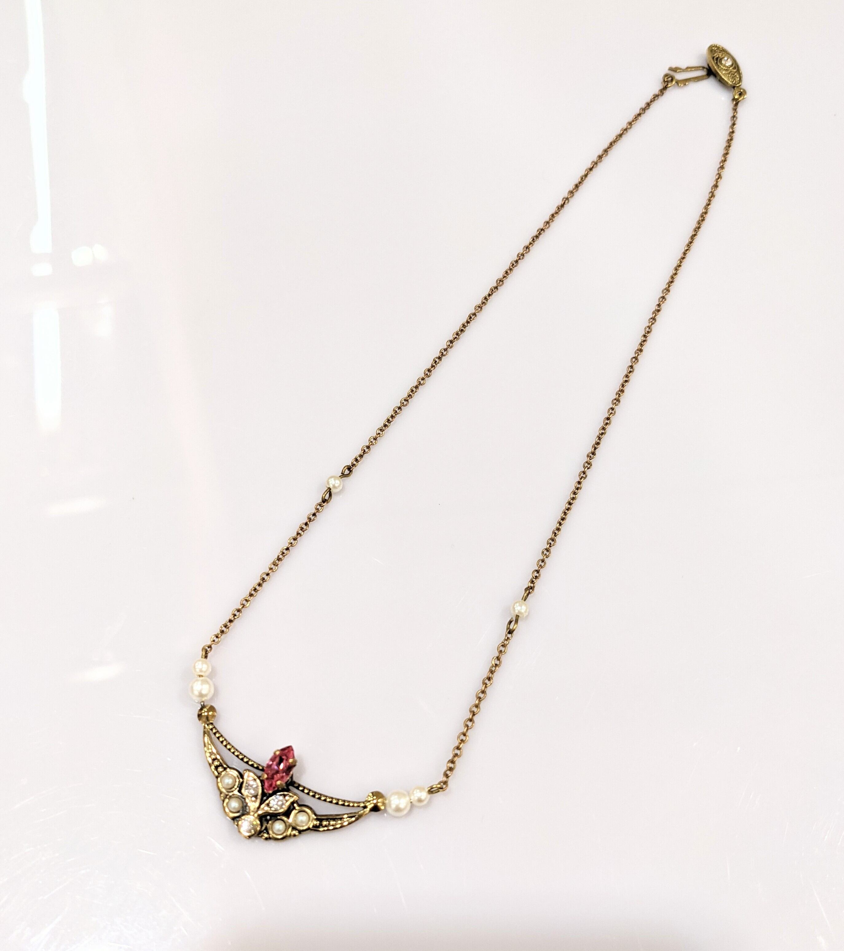 アンティーク風のネックレス。デザインから留め具迄ディテールにこだわった商品でピンクのからージルコニアがポイント。