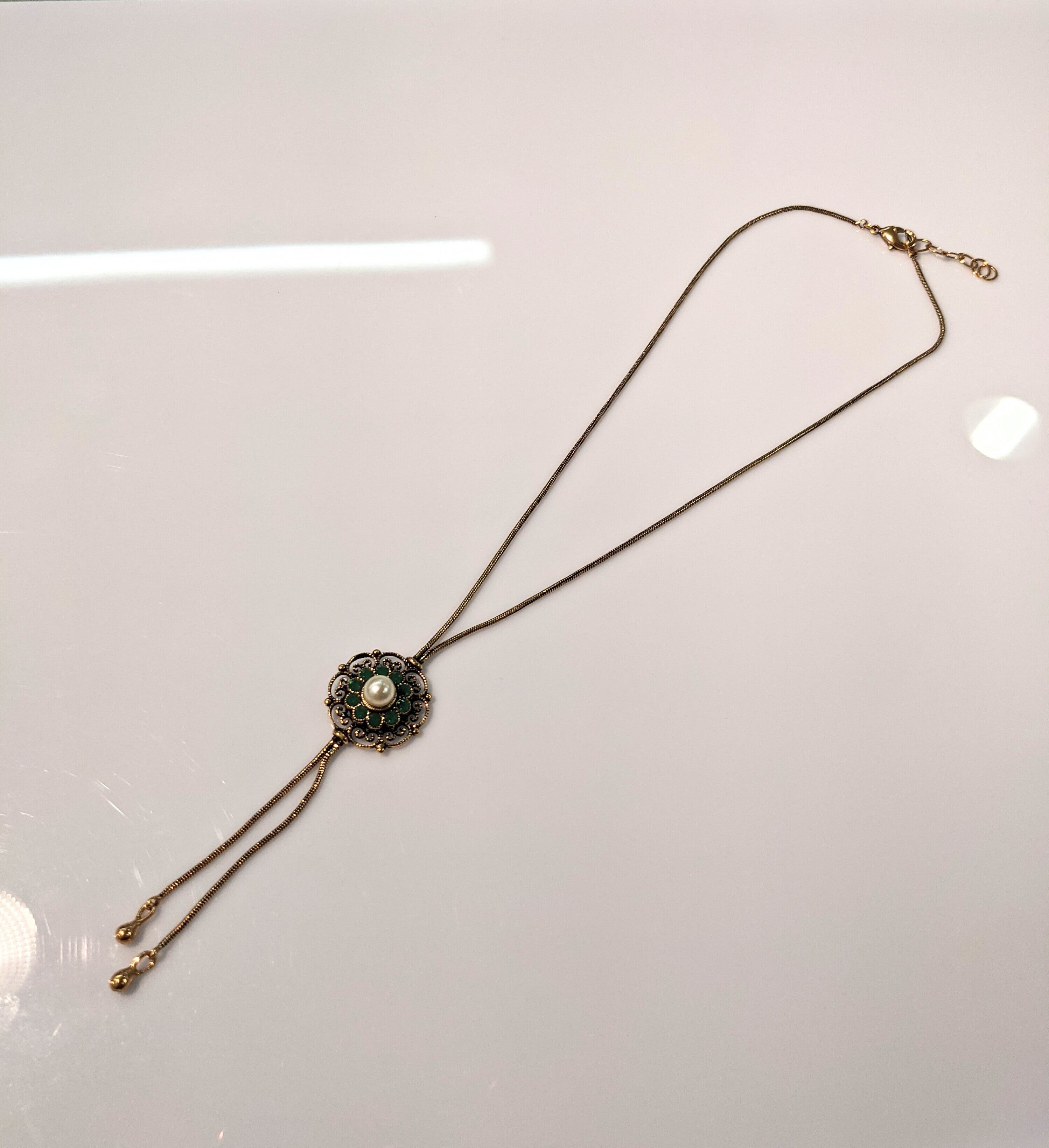 ヘッドも2段重ねてはんだ付け、濃いグリーンのスワロフスキーを周りに、中心にガラスパールを配置。