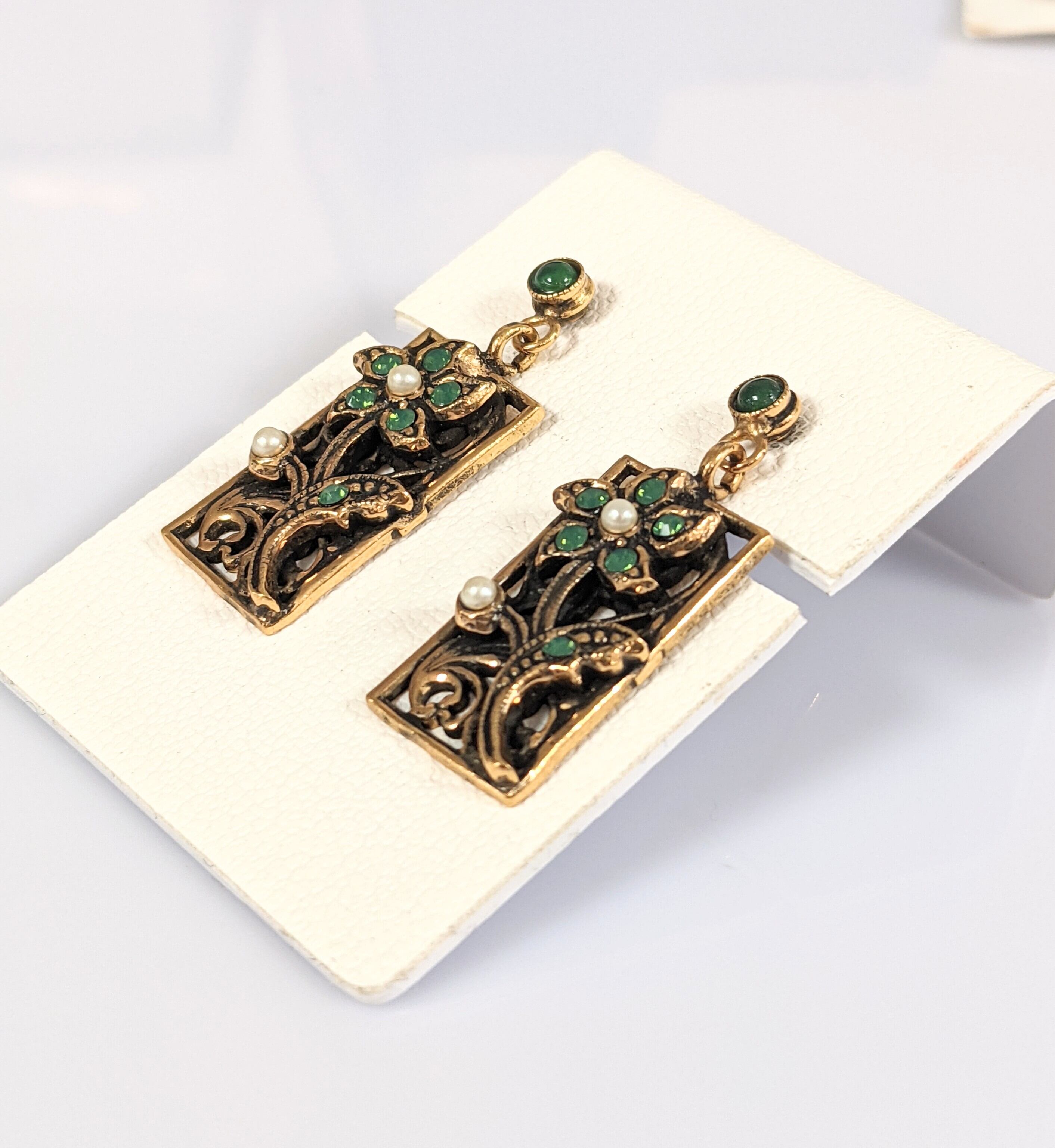 真鍮にゴールドコーティング、ガラスパールピアス、スワロフスキ-長方形2.2cm