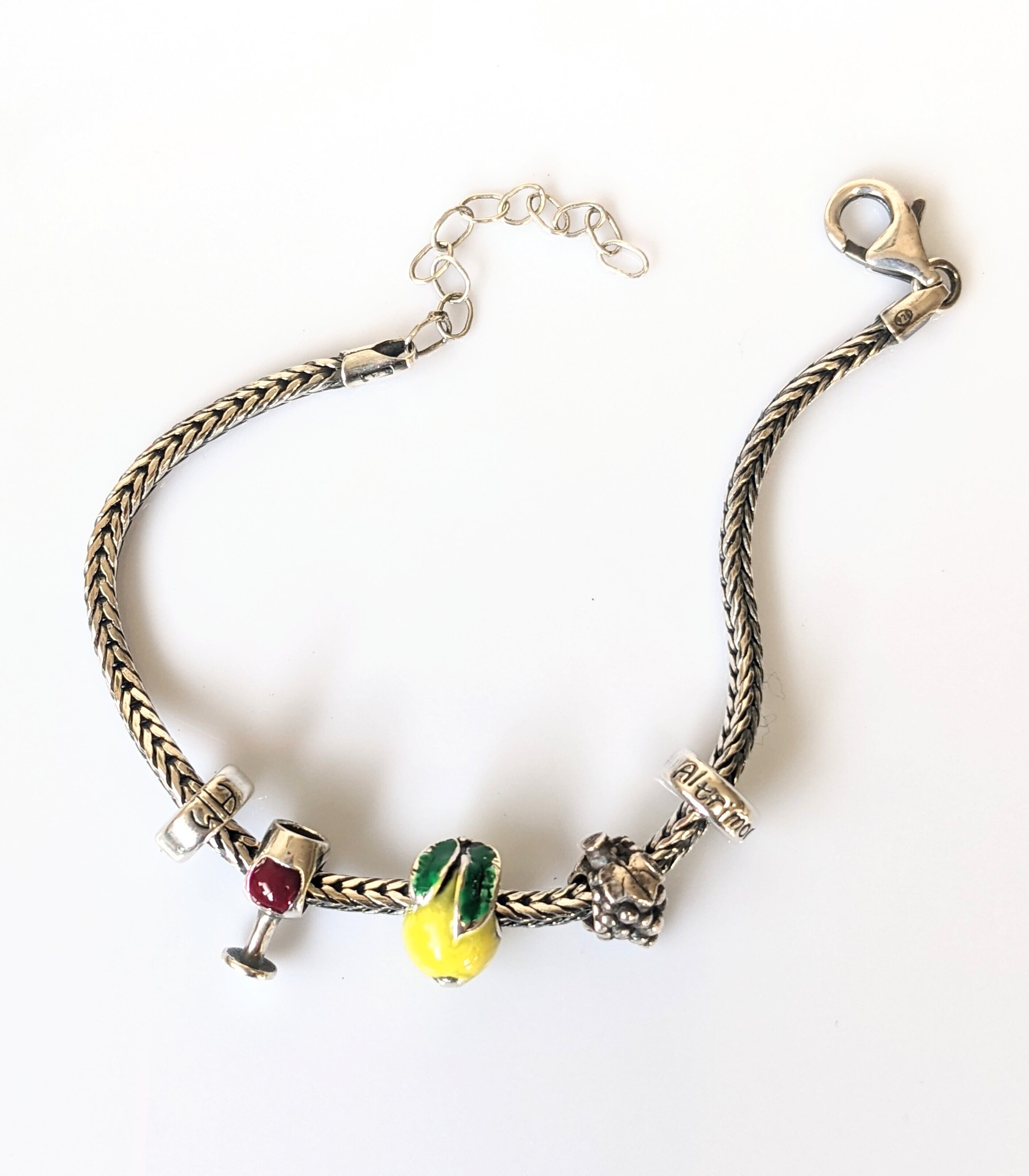 ワインは赤、レモンは黄色と緑のエナメルで色付け。ブランド名の刻印も。