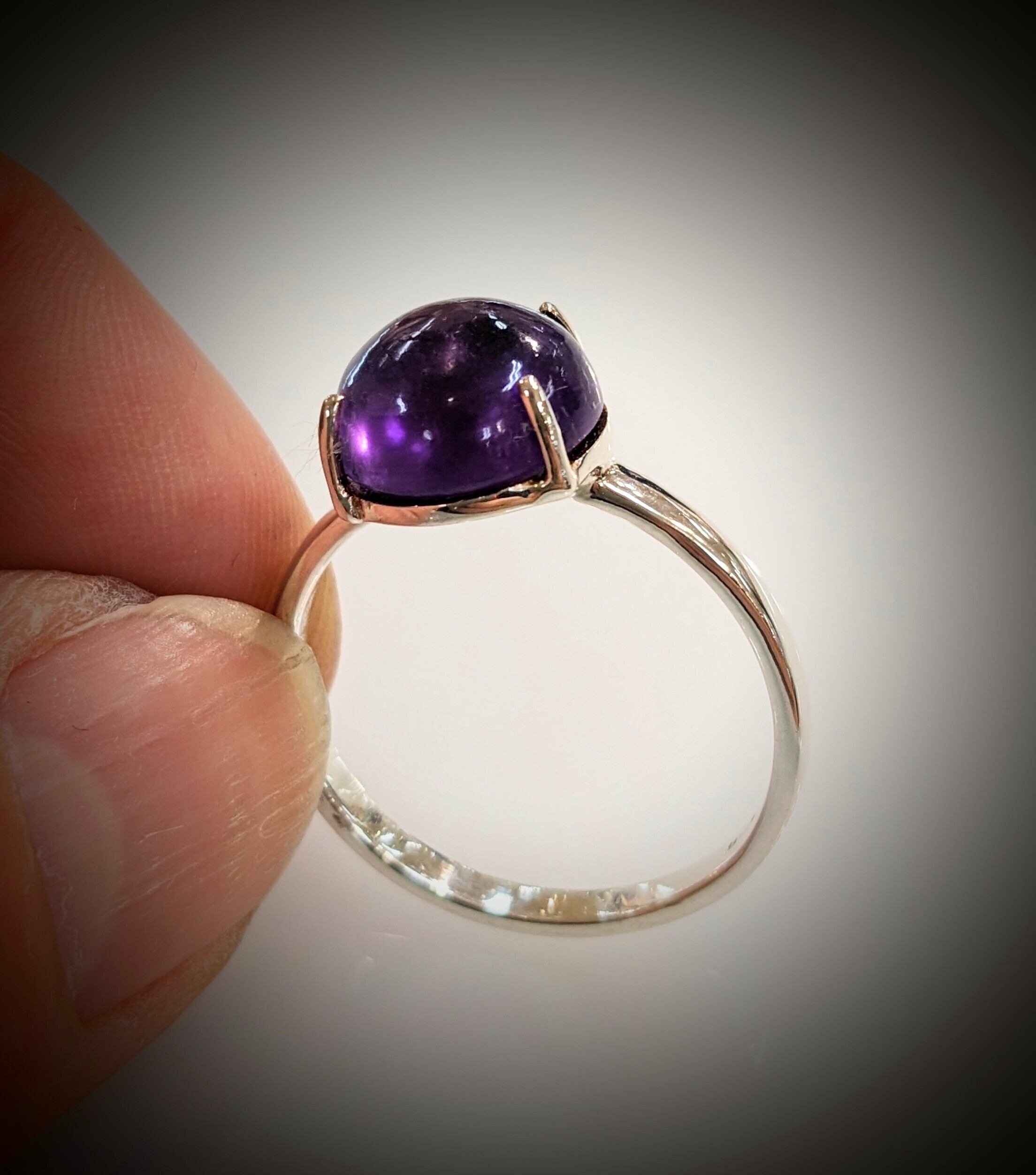 アメジストはパワーストーンの一つで、愛の象徴や心の平穏をもたらすと言われています。リングのデザインはシンプルでありながら、アメジストの輝きが引き立つようにカボーションカットを施しています(◕ᴗ◕✿)